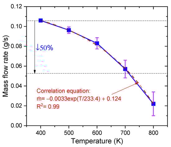 Figure 19 shows the liquid mass flow rate at five different heat reflux temperatures. The blue solid curve value is the average liquid mass flow rate within 200 ms. The width of error bars represents the fluctuation amplitude of the transient liquid mass flow rate. According to the results, the liquid mass flow rate decreases rapidly from 0.106 g/s to 0.022 g/s with increasing the heat reflux temperature (from 400 K to 800 K). Due to the increased instability of the gas–liquid flow at high heat reflux temperatures, the amplitude of the transient liquid mass flow increases. When the outlet temperature exceeds 700 K, the transient liquid mass flow rate in the capillary tube was already reduced by more than 50%. Such a large drop in the ADN-based propellant mass flow rate should be avoided in practical applications, so the heat reflux temperature must be controlled within 700 K. Finally, the equation for the correlation (see Figure 19) between the heat reflux temperature and the liquid mass flow rate was determined by the fitting method.