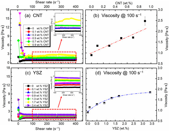 Rheological behaviors of slurries containing (a) CNT and (c) YSZ at various wt.% of the additives as a function of shear rate at room temperature. Comparison of viscosity of (b) CNT− and (d) YSZ−bearing resins at a constant shear rate of 100 s−1.