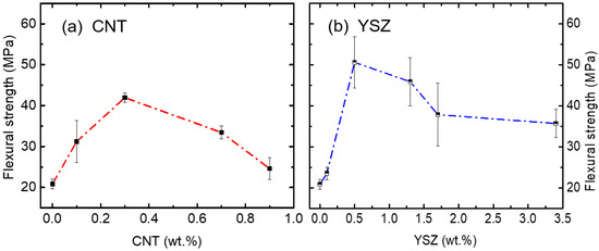 Flexural strength of (a) CNT- and (b) YSZ-added specimens as a function of additive amounts. The flexural strength increases up to 41.9 ± 1 MPa when 0.3 wt.% of CNT is added and decreases significantly thereafter. Whereas the 0.5 wt.% YSZ-added specimen shows a maximum flexural strength of 50.6 ± 6 MPa and maintains its strength higher than a value of 35.7 ± 3 MPa after increasing YSZ content to 3.4 wt.%.