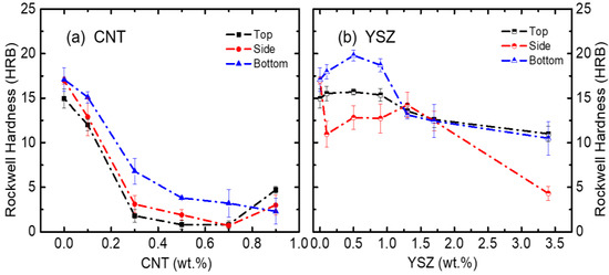 Variation of Rockwell hardness with increasing contents of (a) CNT and (b) YSZ particles, respectively, at top, side, and bottom regions of 3D-printed teeth. Rockwell hardness decreases with increasing CNT content, whereas it shows hardness enhancement for YSZ-added specimens, especially at the top and bottom regions when YSZ content is lower than 0.9 wt.%.