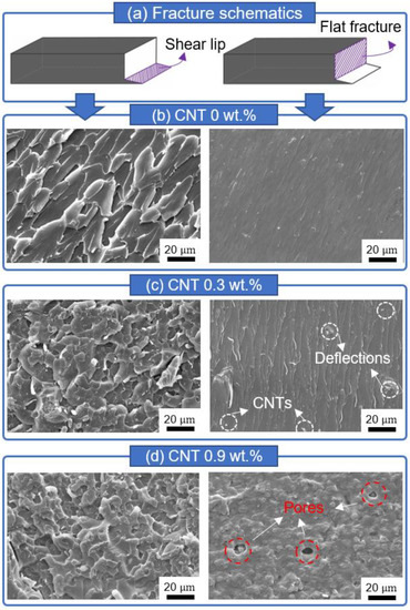 Typical SEM images of CNT-added specimens after the three-point bending test: (a) Schematic description shows typical fracture surfaces of combined shear lip and flat fracture. (b) SEM images of pure resin show coarse dimples with torn-off traces on the shear lip region, whereas it exhibits a smooth and even surface on the flat fracture region. (c) Fracture surface of the 0.3 wt.% CNT-added specimen contains smaller dimples decorated with CNT particles, deflecting crack propagation. (d) Fracture surface of the 0.9 wt.% CNT-added specimen exhibits a large number of pores detrimental to mechanical strength.