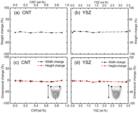 (a,b) Weight and (c,d) dimensional changes of 3D-printed teeth for CNT− and YSZ−added specimens, respectively, after 3 days of treatment with Listerine®. No significant changes in weight and size were observed for both CNT− and YSZ−added specimens.