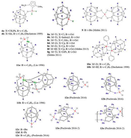 Incompletely condensed silsesquioxanes with different numbers of silanol groups and completely condensed silsesquioxanes with OH side group were successfully applied as single or additional ancillary ligands for the main groups and transition metals [37]. Complexes of that type, as mentioned before, were employed as catalysts for various chemical reactions, including olefin polymerization precatalysts based on transition metals of groups four to six of the periodic table [38]. However, it should be noted that studies concerning catalytic olefin polymerization have limited scope and concern mainly polyethylene synthesis and, to a small extent, the polymerization of higher 1-olefins. Moreover, in many cases, such complexes were investigated in olefin polymerization as models of catalysts immobilized on silica.