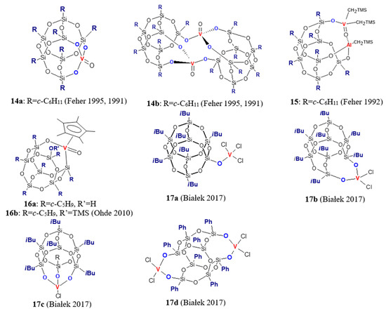 Silsesquioxane complexes of the fifth (Figure 3) and sixth (Figure 4) group transition metals for olefin polymerization are rather rare in literature, although the first information about vanadium and chromium complexes appeared as early as the early nineties of the last century. Feher et al. synthesized an oxovanadium–silsesquioxane complex (c-C6H11)7Si7O9(O3V = O), which, in solution, exists as a mixture of monomeric (14a) and dimeric (14b) forms [49,50]. Its activation with Me3Al (1–5 equiv/V) gave an active catalyst (the dimer 14b is not directly involved but is a precursor to 14a [49]) that produced linear polyethylene with Mw equal to 47,900 g/mol, Mw/Mn = 2.28, and a high melting temperature of 131.6 °C [50]. Further research showed that oxo-vanadium(V) alkyl complex 15 also polymerized ethylene to polyethylene with similar properties, though its dispersity was larger (Mw/Mn = 5.72) [51]. Among vanadium silsesquioxane complexes, similarly as among the forth group transition metals complexes, there are those containing a cyclopentadienyl co-ligand. Complexes 16a and 16b activated by PMAO (polymethylaluminoxane free of trimethylaluminum) and ethylaluminiumdichloride were found to polymerize ethylene at atmospheric pressure with activity of 74–190 kg/(molV·h) [52]. No clear trends for the effects of complex structure and the cocatalyst type on the activity were observed. On the other hand, the molecular weight and dispersity of the produced polymers were dependent on cocatalyst type. Ultra-high molecular weight polyethylenes with Mw around 2·106 g/mol and Mw/Mn around 5.8 were produced in the presence of PMAO, whereas EtAlCl2 led to products with lower Mw and dispersity (Mw ≈ 6.5·105 g/mol, Mw/Mn = 2.9).