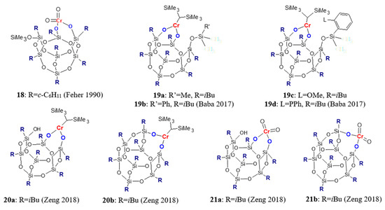 Chromium–silsesquioxane compounds (Figure 4) have been studied in the polymerization of ethylene as homogeneous models of Philips-type catalysts for ethylene polymerization [54,55,56]. Feher and Blanski synthesized 18 and found that it polymerized ethylene at 1 atm pressure after addition of 1.5–10 equivalent of Me3Al and produced linear polyethylene with Mw = 30.7 × 103 g/mol [54]. In much later work [56], chromium–silsesquioxane compounds 19a–19d were obtained by reaction of Cr[CH(SiMe3)2]3 with functionalized POSS: R7Si7O9(OH)2(OSiMe2R’) where R = iBu, R’ = Me, Ph, C6H4(OMe-2), C6H4(PPh2–2). It was shown that catalyst activity and the molecular weight of polyethylene were sensitive to the coordination environment of the chromium center. The activity of chromium complexes towards ethylene polymerization in the presence of (iBu)3Al at 60 °C and at 0.5 MPa ranged from about 30 to about 60 kg/(molCr·h), and it was dependent on the modification of the POSS cage as follows: 19b < 19c < 19a < 19d. Complexes 19a and 19b at 50 °C gave polyethylene with a very high molecular weight (Mw = 1.8·106 and 3.3·106 g/mol), with a rather wide molecular weight distribution (MWD) due to slight tailing on the low molecular side. At the same reaction condition, complexes 19c and 19d produced bimodal polyethylene with lower Mw. The effect of the POSS cage structure and the chromium oxidation state on ethylene polymerization was presented in [55]. Complexes 20a, 20b, and 21a, 21b were synthesized in the reaction of POSS-triol and POSS-diol with Cr(III) (Cr[CH(SiMe3)2]3) and Cr(VI) (CrO3) compounds, respectively. Tri-n-octylaluminum and triisobutylaluminium modified with butylated hydroxytoluene (TIBA-BHT) were used as cocatalysts. It was revealed that all investigated complexes were less active than the appropriate chromium compounds supported on SiO2, and that the Cr oxidation state has an important effect on the behavior of the catalyst. Complexes containing Cr(VI) exhibited higher activities (up to 523 g/(gcat·h)) than trivalent ones (up to 64 g/(gcat·h)). Produced polyethylenes had bimodal molecular weight distributions.