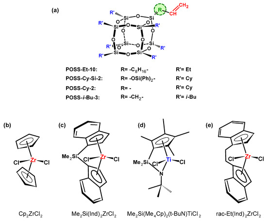 The first literature report related to homopolymerization of POSS and copolymerization of POSS with ethylene or propylene was published by Tsuhida et al. [68]. The POSS-Et-10 comonomer (Figure 5a) was homopolymerized and copolymerized with ethylene or propylene. The polymerization was carried out over the metallocene complexes: Cp2ZrCl2, Me2Si(Ind)2ZrCl2, and Me2Si[(Me4Cp)(t-BuN)]TiCl2 (Figure 5b–d) activated with methylaluminoxane (MAO). It was found that during homopolymerization of POSS, only di- or trimers were obtained. The copolymer with highest POSS content of 24.5 wt.% was synthesized by Me2Si[(Me4Cp)(t-BuN)]TiCl2 complex (Figure 5d). Additionally, it turned out that the POSS comonomer caused a decrease in molecular weight of the obtained copolymers in comparison with neat polyolefins, and, therefore, took part in the termination reaction of macromolecules. Moreover, incorporation of POSS into the polymer chain resulted in slightly improved thermal stability (decomposition temperature, Td, of copolymers increased by 13 °C) in comparison with neat polyethylene and polypropylene.