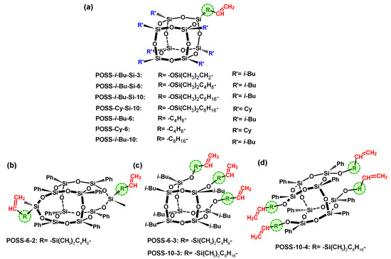 Structures of silsesquioxanes containing: monoalkenyl (a), dialkenyl (b), trialkenyl (c), tetraalkenyl (d) reactive substituents [71,72,73,74,75,76,77,78,79].
