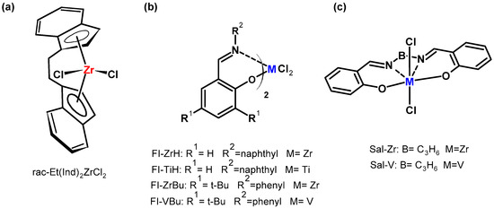 A metallocene complex (Figure 7a) and, for the first time, post-metallocene catalytic systems were applied in copolymerization of ethylene with POSS (Figure 7b,c).