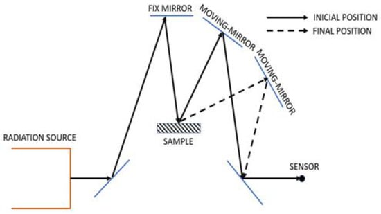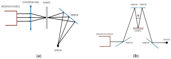 The experiment was conducted using 100 FT-IR and FT-NIR spectrometer devices, which operate in the infrared band with a wavelength ranging from 1.2 to 15 µm, with the maximum intensity corresponding to a wavelength of 4.26 µm, which indicates that the source temperature of the spectrometer is approximately 680.29 K, obtained by the Wien displacement law [8]. The air inside the equipment was previously purged, eliminating water vapor and CO2 for all experiments performed. Transmittance measurements were done with the sample positioned at the focus of the spectrometer converging lens. The radiative beam falls directly on the surface of the sample and passes through it. The numerical value of the unabsorbed energy intensity of the beam that passes through the sample was determined by the sensor inside the spectrometer. According to the 100 FT-IR and FT-NIR spectrometer manual, the incident beam opening angle is 5°. In order to obtain the radiative properties dependent on normal reflection, the accessory already specified for the reflectivity test was coupled to the spectrometer. The incident radiative beam on the surface of the sample was at an angle, α, of approximately 10°. The fraction of the reflected energy was directed towards the second mirror to, in sequence, fall directly on the sensor where the data will finally be processed. Figure 2a,b show the simplified scheme of the path of the radiative beam passing through the sample for measuring the directional/normal transmittance and the directional/normal reflectance, respectively. [9]