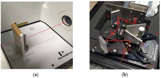 Figure 5a,b show how the samples were positioned inside the equipment before executing the normal and diffuse transmissibility and reflectivity tests, respectively. Numbers 2, 5, 3 and 6 in Figure 5b correspond to the moving mirrors of the accessory used for the reflection tests. Number 4 represents the sample positioned, while numbers 6, 7 and 8 indicate the mirror angle in meters. The opening indicated by the number 1 is from where the radiative beam leaves the FTIR to enter the reflection test accessory.