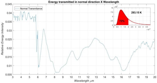 Figure 7 presents the experimental data of the beam intensity that crosses the sample, normalized in relation to the background signal, referring to the transmission measurement. Its assembly scheme is shown in Figure 5a. These measurements were performed for a spectral band that has wavelength values varying from 3 µm to 20 µm, which correspond to the energy emitted by the FTIR thermal source. The maximum value for the normalized intensity of the beam passing through the sample is 0.0408, and it occurs at a wavelength of approximately 3.928 µm. All theoretical data were treated considering the absorptivity of the plastic film [10].
