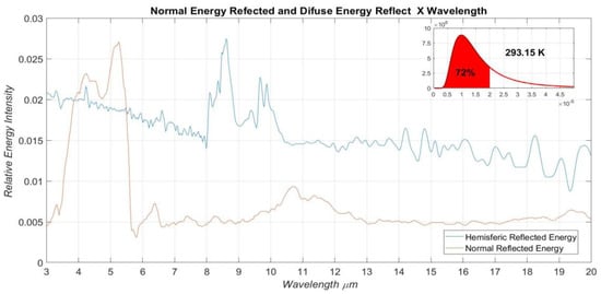 Figure 8 presents the experimental data related to the normal and diffuse reflectance measurements as a function of the same wavelength range of the normal transmittance measurement. The maximum relative values of the normally and diffusely reflected energy intensities are 0.0271 and 0.0268, respectively, which happens at the wavelengths of approximately 8.06 µm and 5.26 µm. The reflectance measurements were based on the assembly presented in Figure 2b and Figure 3. These experiments were conducted in the accessory pertinent to the reflectivity test, as shown in Figure 5b.