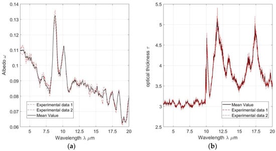 Figure 9a,b show, respectively: the albedo and optical thickness values. These were numerically determined by the Gaussian linearization method, also known as the inverse method, based on experimental data for the spectral band in which the experiment was carried out.