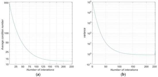 Conditioning number of matrices. (a) Average conditioning number of matrices for each average wavelength as a function of iterations and (b) variation of conditioning function number for each of the iterations.