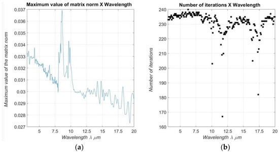 As proposed, the present work uses the definition of the Neumann series as an alternative to find the solution for the linear problem, A.X = B, which is generated for each iteration. The Neumann series is defined as: where is an identity matrix and the exponent n the series expansion order, which is a variable strongly dependent on the precision required by the problem [6]. The Neumann series is applicable to any problem if, and only if, [18,19]. Figure 11a,b show the maximum value for the norm of the sensitivity matrix A for each wavelength and the number of iterations also performed in wavelength function, respectively.