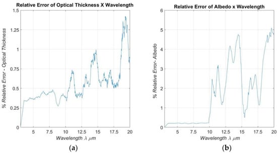 Figure 12a,b present the relative percentage deviation of albedo and optical thickness, respectively, calculated using the Neumann method in relation to the Gauss–Jordan method. The deviation was obtained through the mathematical relation: , where indicates the parameter value obtained through the Neumann method and is the parameter value obtained through the Gauss method.