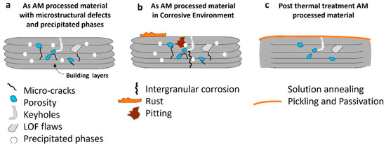 Corrosion could be controlled by the existence of defects that are caused during the additive manufacturing process; therefore, it is important to know the defects present in a material processed by AM and their influence on the final properties. In this section, the description of the main defects found in the literature and their direct correlation to the properties of several components of alloys obtained by the AM process will be shown. The main defects are not strictly categorized by a unique type; nevertheless, the most frequently found are cracks, porosity, residual stresses, non-homogenous microstructure, unbalanced chemical composition, brittle phases nucleation, properties anisotropy, and microgalvanic cells. Some of these defects are shown in the schematic illustration in Figure 3a, which represents their formation during the layer-by-layer building procedure of AM processes; for example: porosity, lack of flow parts, keyhole defects, microcracks, and the formation of intermetallic phases that are not visible macroscopically (not represented in the scheme). Figure 3b details the appearance of additional defects due to the influence of a corrosive environment on the as-built AM component. For instance, intragranular corrosion and pitting corrosion defects could be present in the microstructure along with the AM process defects, causing significant microstructural damage. Figure 3c offer a general view of a component after post AM processes such as solution annealing treatment at a certain temperature and during a specific time, as well as the surface pickling passivation process, which improves the homogenization of the microstructure and protects, superficially and internally, the material from corrosive environments, respectively.
