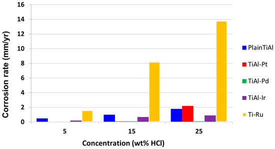 Corrosion rates of Ti-Al alloys with Pt-group metal additions in 5, 15, and 25 wt-%HCl solutions [99].
