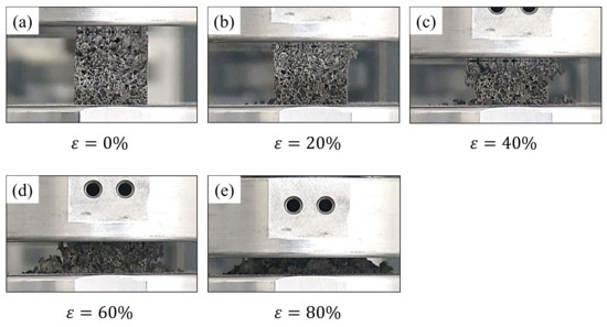 Compression tests of the prepared specimens were performed using a universal testing machine (Instron 5582). The compression speed was 5 mm/min. The compressive stress σ was estimated by dividing the compressive load obtained from the compression test by the initial cross-sectional area of the specimen (25 mm × 25 mm). The compressive strain ε was estimated by dividing the compressive displacement obtained from the compression test by the initial height of a specimen (25 mm). Plateau stress was defined as the average σ at ε = 20–30% on the basis of JIS-H-7902 [45]. The compressive deformation behavior of the specimen during the compression test was recorded using a digital video camera.