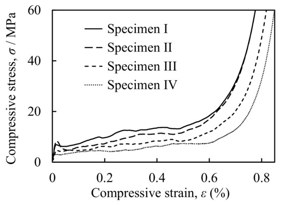 Figure 4. Representative stress–strain curves during compression tests of four specimens.