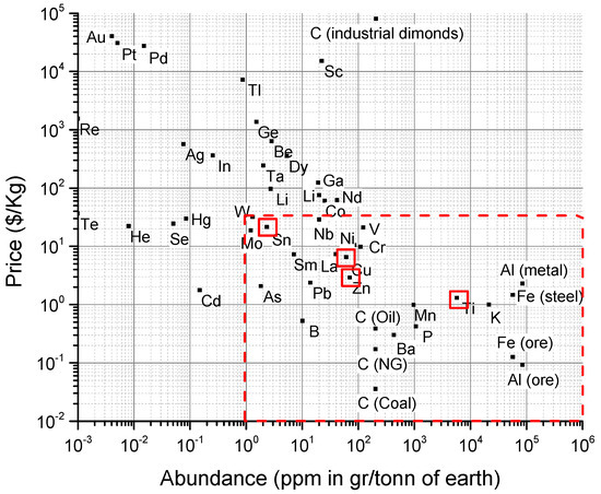 Abundance and price of elements with Ti, Ni, Sn, and Cu marked data from Hurd et al. [11].