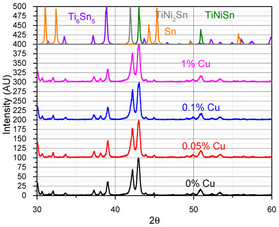 XRD of the TiNi1-xCuxSn directly after arc melting, showing mainly TiNiSn, TiNi2Sn, and Ti6Sn5. Black—0% Cu, Red—0.05% Cu, Blue—0.1% Cu, Pink—1% Cu. Theoretical phases—Green TiNiSn, Gray—TiNi2Sn, Orange—Sn, Purple Ti6Sn5.