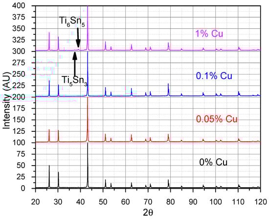 After heat treatment at 1163 K for 100 h, only the TiNiSn HH phase was seen in the samples. In Figure 3, the samples of 0–1% Cu can be seen showing a single phase of TiNiSn with a small amount of the Ti6Sn5 and Ti5Sn3 phases in the 1% sample. This might be an indication that the amount of copper that can sit on the Ni site (i.e., the solubility limit) is very low. If the Cu is indeed sitting at a vacancy site instead of the Ni site there will be 1% nickel missing initiating the nucleation of some Ti6Sn5 and Ti5Sn3. These phases have been inferred by EDS results. The backscattered SEM image shows some Ti6Sn5 as well as Ti5Sn3 precipitates, which were measured by EDS and marked in Figure 4 for the 1% sample. No similar phases were found for the 0.05%- and 0.1%- Cu-doped samples. This might also indicate that there is a 0.2% Sn; however, this has not been seen by SEM or XRD and is undetectable in these methods.