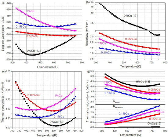 From Figure 5a, the negative Seebeck coefficient values indicate the n-type nature of all the investigated compositions. A clear trend of absolute Seebeck coefficient values decreasing, with increasing the Cu doping amount, at low temperatures, can be seen as is expected upon increasing the charge carriers upon the electron donor Cu doping. The behavior of the samples is changing, with the 1% sample overtaking the 0.1% sample after 600 K. This could be due to the secondary phases in the 1% sample. The electric resistivity of the samples, seen in Figure 5b, follows a similar trend with lower resistivity with more Cu additions; however, 1% Cu is again outside this trend with higher resistivity than the 0.1% sample. Finally, the thermal conductivity, in Figure 5c, shows that with low charge carriers (0 and 0.05%), a similar trend emerges, whereas, with higher charge carriers, the inflection point of the thermal conductivity is lowered by about 100 K showing a more metallic behavior as expected. In Figure 5d, it can be seen that copper addition lowers the lattice’s thermal conductivity. This is not surprising as both alloying and doping are expected to break some symmetry; however, it is a greater change than expected with such a low doping rate. This might be attributed to an additional disordering due to the fact that a copper atom is not necessarily occupying the nickel site as nickel and copper are very similar in size and should offer very similar thermal conductivity through them.