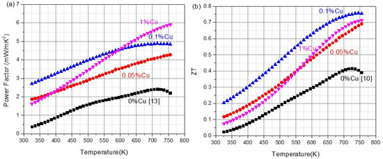 Finally, the power factor and ZT of the samples are shown in Figure 6a,b, respectively. The power factor tops up at 6 (mW/mK2) for the 1% sample and is about two and a half times (145% improvement) the maximal temperature. However, the average power factor is for the 0.1% sample over this temperature range, with 2.5 times the average power factor (151% improvement). The ZT reaches high values of up to 0.75, with the 0.1% Cu doped sample being the highest performing sample topping the undoped sample at 81% improvement at the max. The most surprising is that the ZT of this sample is higher at all the investigated temperature ranges, showing an average ZT of 0.5 over this entire range, indicating over 125% improvement over the undoped sample.
