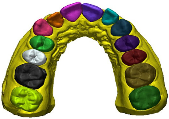 The STL files (T0, T1, and T2), were imported into Geomagic Control X (3D Systems, Rock Hill, SC, USA), a 3D metrology software. Digital models were imported in pairs: first, T0 − T1 were compared to measure the amount of planned movement; then, T0 − T2 were compared to establish the amount of obtained movement. T0 was always designated as “reference data”, and T1 or T2 were designated as “measured data”. The pretreatment digital model (T0) was partially segmented by isolating individual teeth, from canine to first molar on both sides (left and right) (Figure 1). The segmentation allowed us to perform a partial surface-based best fit with 50 iterations for each tooth in order to identify the same landmarks in the .stl files that would be used to obtain the linear measurements (transverse diameters). To obtain the angular measurement (molar inclination), the occlusal reference plane [33] was defined on T0. Then, for each pair of digital models (first, T0 − T1, then T0 − T2), an initial superimposition by means of a “3-point alignment” (based on the mesiobuccal cusp tips of the first molars and on the mesial-incisal point of the right central incisor) was performed, followed by a global best-fit registration with 50 iterations.