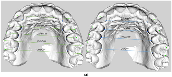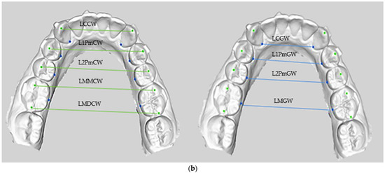 Landmarks and transverse parameters on the buccal and gingival side. (a) Upper arch transverse diameters. Upper canine gingival width (UCGW); upper first premolar gingival width (U1PmGW); upper second premolar gingival width (U2PmGW); upper first molar gingival width (UMGW); upper canine cusp width (UCCW); upper first premolar cusp width (U1PmCW); upper second premolar cusp width (U2PmCW); upper first molar mesiobuccal cusp width (UMMCW); upper first molar distobuccal cusp width (UMDCW). (b) Lower arch transverse diameters. Lower canine gingival width (LCGW); lower first premolar gingival width (L1PmGW); lower second premolar gingival width (L2PmGW); lower first molar gingival width (LMGW); lower canine cusp width (LCCW); lower first premolar cusp width (L1PmCW); lower second premolar cusp width (L2PmCW); lower first molar mesiobuccal cusp width (LMMCW); lower first molar distobuccal cusp width (LMDCW).