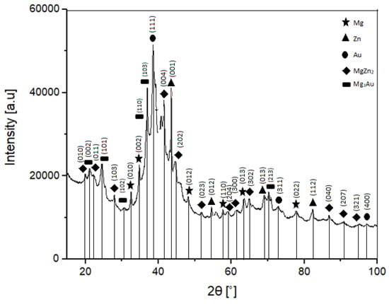 The Mg3Au phase is a highly stable phase, which is confirmed by its presence in both powder and sintered diffraction patterns (Figure 1 and Figure 2). The temperature of the sintering process did not affect the Mg–Au phase, unlike the Mg–Zn phase, where the sintering temperature causes diffusion and formation of the Mg7Zn3 phase next to the already existing MgZn2 phase. In addition, it should be noted that the stability of the Mg–Au phases is also reported by Ferro []. This is due to the fact that Au alloys with elements of the second group are characterized by strongly negative values of the enthalpy of formation.