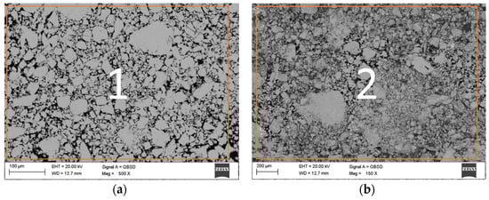 The produced sintered samples were subjected to X-ray analysis and observed on a SEM. Their microhardness was also tested. Sintered samples were tested in a compression test on a Zwick Z020 testing machine (Zwick Roell Group, Ulm, Germany) according to EN ISO 3327 []. Samples were prepared with a base-to-height ratio of approximately 1:1.5 in cylindrical form. The result of the tests was plots of the relation between compressive strength and deformation of the sample. A compression test was used to determine compressive strength and the Young’s modulus. All the results were presented as the mean value. The samples were loaded to fracture at a rate of 2 mm∙min−1 at room temperature.