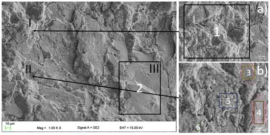 The SEM image with featured regions of the EDS analysis (marked with the Arabic numerals, the EDS values shown in the Table 2) obtained for the sintered Mg63Zn30Ca4Au3 alloy. Area marked with “I” and “II” refers to the (a) and (b) images, respectively, where the intercrystalline fractures can be seen. The region marked as “III” is presented in Figure 5.