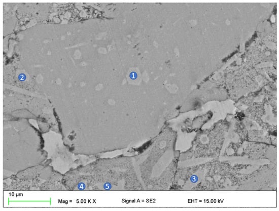 The SEM image featuring MgZn2 phase regions in the powder sample. The numbers in the image refer to the EDS analysis results which are showcased in Table 4.