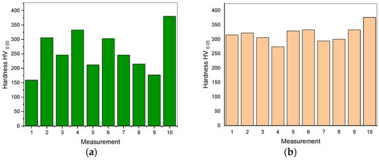 The results of both powder and sintered samples are shown in the Figure 11a,b, respectively. The average values were 258 ± 71 HV for the powdered sample and 318 ± 28 HV for the sintered one. The hardness of the sintered sample is much higher than that of the powders.