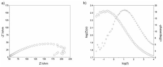 Impedance spectra obtained for Mg–Zn–Ca–Au sintered alloy. (a) Nyquist diagram, (b) Bode’s diagram. The symbols in (b) refer to the amplitude (circles) and phase spectra (“plus” sign).