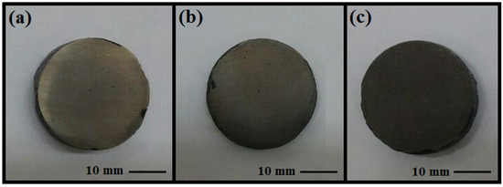 To create Mg-6Zn/TiO2-MWCNTs composite via the SPM technique [32], TiO2 nanoparticles and CNTs as the reinforcement agents were mixed in a 10:1 weight ratio and were then denoted as TM0 (Mg-6Zn), TM1 (5TiO2-0.5MWCNTs), TM2 (10TiO2-1MWCNTs), and TM3 (15TiO2-1.5MWCNTs). In this regard, in order to achieve homogenous distribution, MgZn composite powder was stirred ultrasonically in 100% ethanol for 2 h. In this case, MgZn was used as a matrix and magnetic stirring was used to mix it for 1 h in ethanol at 600 rpm. At the same time, 0.5, 1, and 1.5 wt% MWCNTs and 5, 10, and 15 wt% TiO2 were ultrasonically dispersed for 3 h in ethanol. A solution containing magnesium composite and MWCNT was kept in the oven under controlled conditions for 1 day. The mixing procedure was carried for 3 h in order to obtain a homogenous mixture. To obtain the composite powder, the mechanically stirred mix was filtered and vacuum-dried at 70 °C overnight. The composite powders were sintered in the SPS chamber for 10 min at 570 °C and 40 MPa pressure to produce green billets with dimensions of 30 mm in diameter and 5 mm in thickness (Figure 1).
