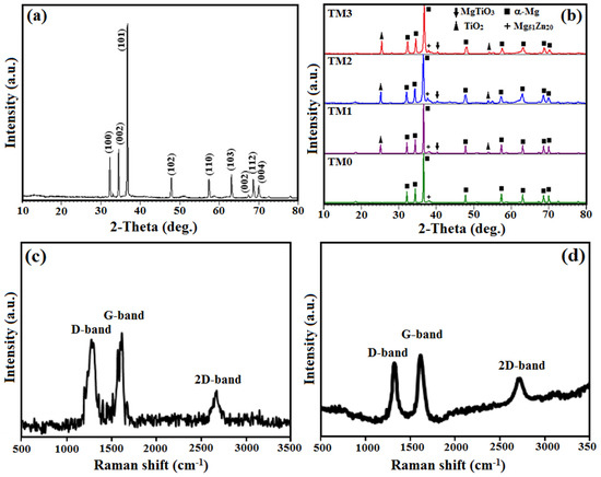 XRD pattern of (a) pure Mg and (b) TM0, TM1, TM2 and TM3 composites, (c) Raman spectra of MWCNTs and (d) TiO2-MWCNTs reinforced MgZn nanocomposite.