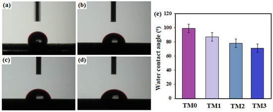 Contact angle of (a) TM0, (b) TM1, (c) TM2 and (d) TM3 composites and (e) values of the contact angles of the TM composites with various TiO2-MWCNTs content.