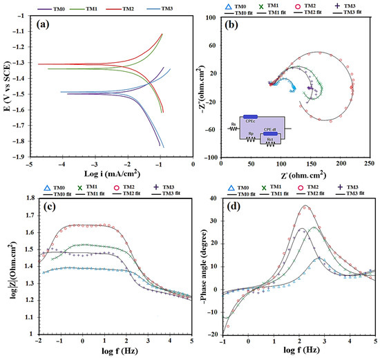 (a) Potentiodynamic polarization, (b) Nyquist plots, (c) Bode magnitude plot and (d) Bode phase curves of TM0, TM1, TM2 and TM3 composites.