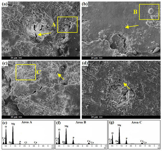 Surface morphology of the (a) TM0, (b) TM1, (c) TM2, (d) TM3 composites after 14 days of immersion in SBF and EDS analyses of (e) Area A, (f) Area B, and (g) Area C. Note: the arrow indicates the crack.