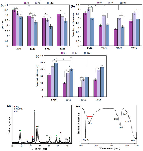 (a) pH value, (b) corrosion rate obtained by weight loss and (c) the rate of H2 evolution of TM0, TM1, TM2, and TM3 composites, (d) XRD pattern and (e) FTIR spectra of TM2 sample after 14 days of immersion in SBF (* p < 0.05, and ** p < 0.01).