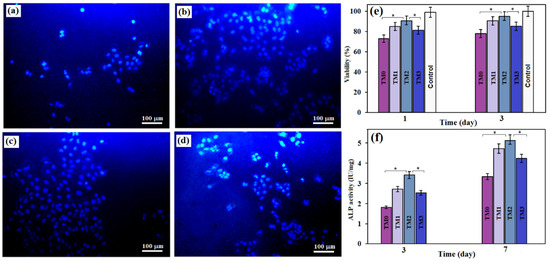 Fluorescent microscopic images of (a) TM0, (b) TM1, (c) TM2 and (d) TM3 (e) Cell viability and (f) ALP activity of TM0, TM1, TM2 and TM3 samples (* p < 0.05).