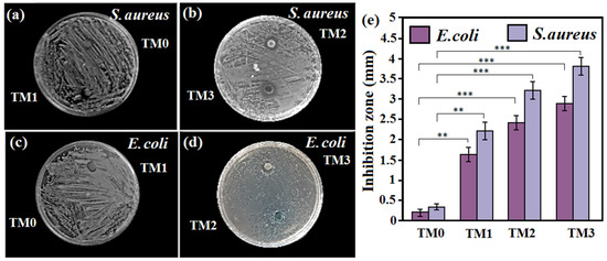 (a) Antibacterial activities of the (a) TM0 and TM1, (b) TM2 and TM3, (c) TM0 and TM1, and (d) TM2 and TM3 composites by the disc diffusion test against both Gram-positive (S. aureus) and Gram-negative (E. coli) and (e) diameters of the inhibition zones for TM0, TM1, TM2 and TM3 samples (** p < 0.01 and *** p < 0.001).