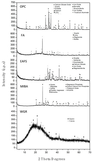XRD analysis of OPC, FA, EAFS, MIBA, and WGR.