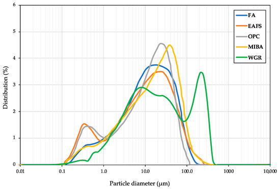 Figure 3 shows the PSD for OPC, FA, MIBA, EAFS, and WGR. The samples of OPC, FA, and EAFS indicated a similar bimodal distribution curve. OPC and EAFS peaked at 25 μm; however, a narrower peak was seen for OPC compared to EAFS. In additon, both binders showed a smaller peak at 0.35 μm, representative of a noteworthy presence of very fine particles. The FA’s distribution followed a similar trend; however, a wider distribution was noticed around 20 μm (peak). A small peak was seen at 0.35 μm for FA as well. Furthermore, MIBA showed a narrow peak at 39 μm with a small one at 0.35 μm. Concerning WGR, its PSD showed a slightly different profile in comparison with the other binders, despite having had the same milling procedure.