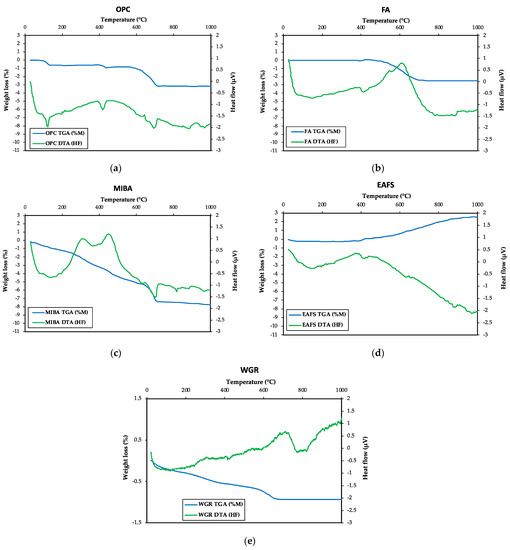 Figure 5 shows the TGA/DTA results of OPC, FA, MIBA, EAFS, and WGR. For OPC (Figure 5a), the profile suggests that the hydrated calcium sulphate (gypsum) that appeared in the XRD spectrum transformed into hemihydrated calcium sulphate at 110 °C. At around 200 °C, it is possible that unhydrated calcium sulphate formed. At 420 °C, around 0.4% of portlandite became depleted due to dehydroxylation. This low amount of lost portlandite reflects its low hydration rate and that it is well stored. Moreover, from 600 °C onwards, the compounds formed by calcium carbonate were decarbonated.