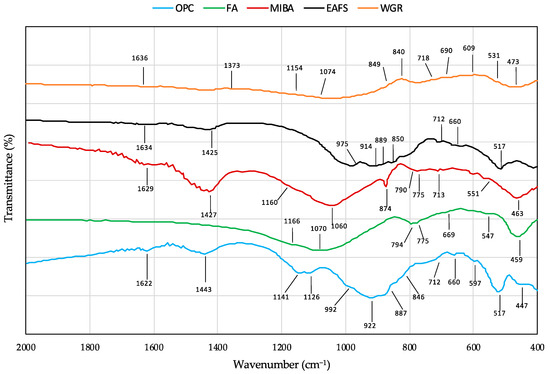 FTIR spectra of OPC, FA, MIBA, EAFS, and WGR.