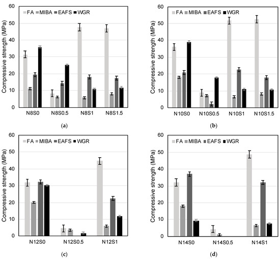 Compressive strength values for mixes with FA, MIBA, EAFS, and WGR with Na2O/binder ratios of (a) 8%, (b) 10%, (c) 12%, and (d) 14%, respectively.